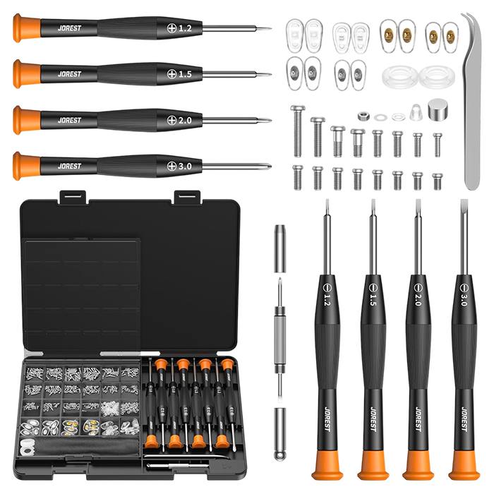 This all-inclusive eyeglasses repair kit ensures you can quickly fix or maintain your glasses anywhere. It features eight types of eyeglass screwdrivers, including a 3-in-1 tiny screwdriver, alongside 16 sizes of eyeglass screws and 12 pairs of silicone nose pads in three styles. The set also contains a curved tweezer for precision, 20 silicone screw caps/shims, 20 metal nuts/shims, four anti-slip covers, a magnetizer to simplify handling tiny screws, and a cleaning cloth, all neatly organized for easy portability. This set of tools basically meets various needs for repairing glasses, which can be used for eyeglass, sunglasses, watches, clocks and some other small electronics.