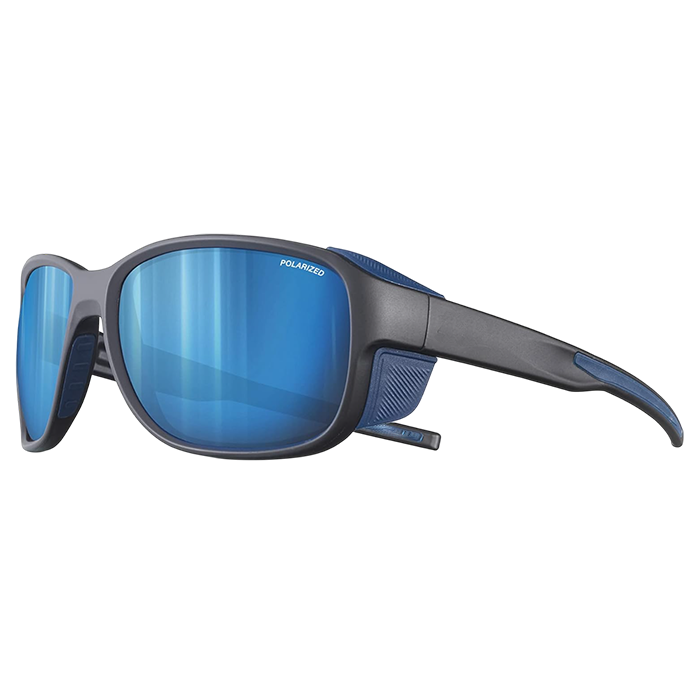 Designed for high-altitude activities like mountaineering and climbing, these sunglasses feature removable side shields that provide extensive coverage from wind and debris. The polarized polycarbonate lens offers a low level of light transmission, intended for use in high-glare environments such as snow, water, or bright alpine settings. An ergonomic frame with a curved profile incorporates rubberized temple tips and flexible nose inserts for a secure fit.